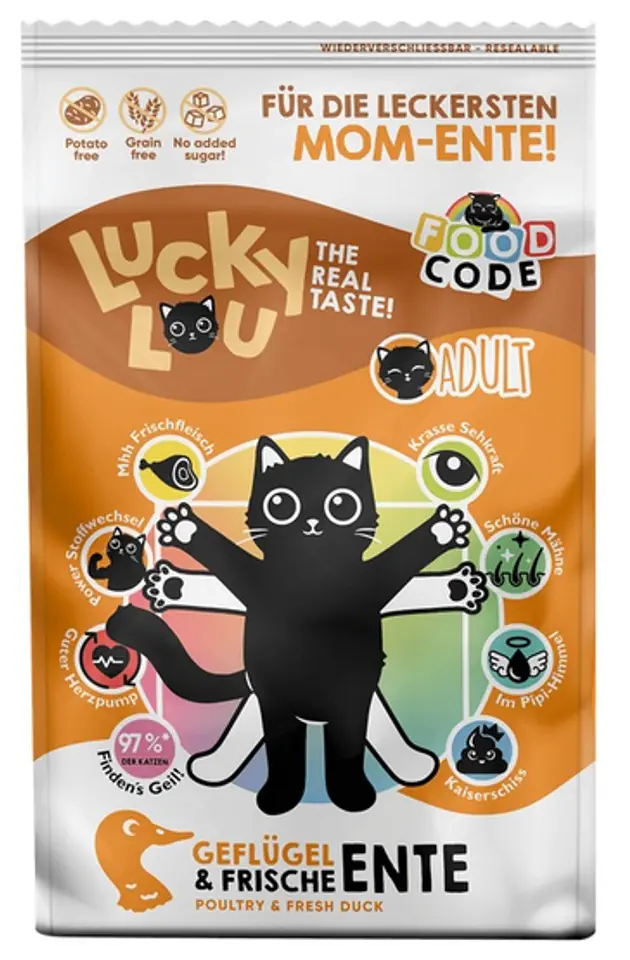Lucky Lou Food Code Lifestage Adult Drób & KaczkaSzukasz Kodu do Szczęścia dla swojego kota, najlepszej suchej karmy? Czy jest fanem karmienia mieszanego? Sucha karma Lucky Lou Food Code to idealne rozwiązanie. Za tą nazwą kryje się starannie opracowany przepis na szczęście. Idealna równowaga smaku i witalności dla kotów.We wszystkich pysznych odmianach znajdziesz korzyści dla kotów w każdym wieku - wszystkie potrzebują innej proporcji składników odżywczych. Ale nie tylko dostosowujemy składniki, ale także dopasowujemy wielkość krokieta dla każdego kota - tak właśnie działa prawdziwy etap życia! Każdy kot znajdzie swoją ulubioną odmianę Lucky Lou Food Code.Nie znajdziesz tu zbóż, dodatku cukru i konserwantów. Nie korzystamy też z inżynierii genetycznej ani testów na zwierzętach. W naszej żywności premium łączymy świeże mięso i wysokiej jakości suszone białko. Dzięki zastosowaniu najnowocześniejszych technologii, najsurowszej kontroli jakości i najwyższej jakości składników, pełnowartościowe przepisy Lucky Lou Food Code stają się absolutnym hitem. Aż 97% kotów, próbujących testowe porcje, uznało to za fajne jedzenie. Nasz kod żywieniowy jest tworzony z kocim zmysłem!Skład:drób 63% (suszone mięso drobiowe 25%, świeże mięso z kaczki 22%, tłuszcz drobiowy, białko drobiowe), tapioka 22%, groszek, marchew, jajo suszone 1%, siemię lniane (świeżo mielone) 0,5%, drożdże piwne 0,5%, kocimiętka 0,5%, cykoria 0,1%Analiza:białko surowe 33%, zawartość tłuszczu 19%, popiół surowy 6,5%, włókno surowe 2,5%Dodatki:cynk (3b603) 80 mg, mangan (3b502) 8 mg, miedź (3b405) 6 mg, jod (3b202) 2 mg, witamina A (3a672a) 18000 IU, witamina D3 (3a671) 1300 IUDawkowanie (żywienie mieszane):
