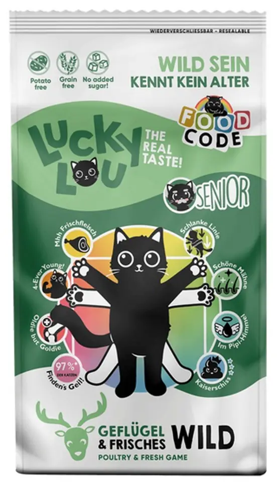 Lucky Lou Food Code Lifestage Senior Drób & DziczyznaSzukasz Kodu do Szczęścia dla swojego kota, najlepszej suchej karmy? Czy jest fanem karmienia mieszanego? Sucha karma Lucky Lou Food Code to idealne rozwiązanie. Za tą nazwą kryje się starannie opracowany przepis na szczęście. Idealna równowaga smaku i witalności dla kotów.We wszystkich pysznych odmianach znajdziesz korzyści dla kotów w każdym wieku - wszystkie potrzebują innej proporcji składników odżywczych. Ale nie tylko dostosowujemy składniki, ale także dopasowujemy wielkość krokieta dla każdego kota - tak właśnie działa prawdziwy etap życia! Każdy kot znajdzie swoją ulubioną odmianę Lucky Lou Food Code.Nie znajdziesz tu zbóż, dodatku cukru i konserwantów. Nie korzystamy też z inżynierii genetycznej ani testów na zwierzętach. W naszej żywności premium łączymy świeże mięso i wysokiej jakości suszone białko. Dzięki zastosowaniu najnowocześniejszych technologii, najsurowszej kontroli jakości i najwyższej jakości składników, pełnowartościowe przepisy Lucky Lou Food Code stają się absolutnym hitem. Aż 97% kotów, próbujących testowe porcje, uznało to za fajne jedzenie. Nasz kod żywieniowy jest tworzony z kocim zmysłem!Skład:drób 50% (suszone mięso drobiowe 27%, świeże mięso z kurczaka 10%, białko drobiowe, tłuszcz drobiowy), tapioka 23%, świeża dziczyzna 10%, groszek, lignoceluloza 3%, marchew, olej z łososia 1%, siemię lniane (świeżo mielone) 0,5%, drożdże piwne 0,5%, cykoria 0,1%, małża zielonowargowa 0,1%Analiza:białko surowe 37%, zawartość tłuszczu 19%, popiół surowy 7%, włókno surowe 2,5%Dodatki:cynk (3b603) 100 mg, mangan (3b502) 10 mg, miedź (3b405) 8 mg, jod (3b202) 2,6 mg, witamina A (3a672a) 18000 IU, witamina D3 (3a671) 1300 IUDawkowanie (żywienie mieszane):