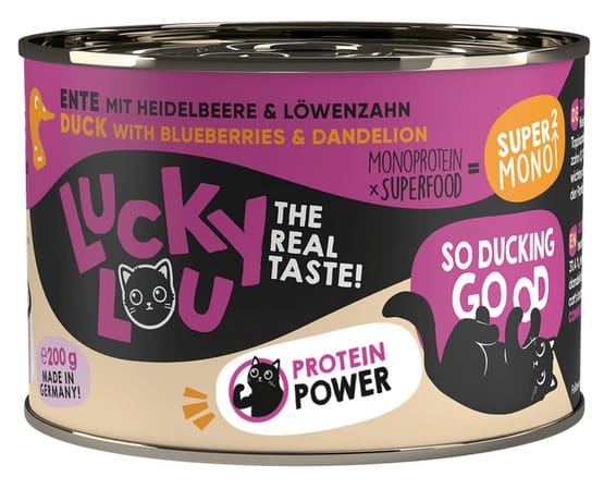 Mieszkasz z kotem o specjalnych wymaganiach dietetycznych? W takim razie mam coś dla ciebie - superżywność dla superkotów! To połączenie jedzenia w jakości superfood i formuły monoproteinowej. Oznacza to, że każda odmiana zawiera tylko jedno źródło białka zwierzęcego. Jest to bardzo ważne dla otwieraczy do puszek kotów o specjalnych potrzebach żywieniowych.Więc teraz już wiesz, co oznacza monoproteina i superżywność, prawda? Jeśli nie, wyjaśnię ci to pokrótce. Superfood jest wtedy, gdy jedzenie smakuje wyśmienicie. Ale nie o to mi tutaj chodzi. Superfoods to super składniki, takie jak żurawina, kocimiętka, rokitnik i malina. Nawiasem mówiąc, zawarte są tu również składniki, które odżywiają dobre bakterie jelitowe! To wszystko sprawia, że karma dla kotów jest jeszcze bogatsza i dostarcza super dobrych składników odżywczych i błonnika.Brzmi całkiem nieźle, prawda? Dodatkowo nie znajdziesz tu też żadnych zbóż, glutenu ani dodatku cukru. To jedzenie dla fanów prawdziwego smaku!Lucky Lou SuperMono - Superpokarm dla Superkotów!Karma produkowana w Niemczech.Skład:Kaczka 65% (w tyn mięso mięśniowe, serce, żołądek, szyja i wątroba), bulion z kaczki 31,4%, topinambur 1,5%, jagoda 1%, minerały 1%, ekstrakt z małży zielonowargowych 0,1%.Składniki analityczne:Białko surowe 9%, zawartość tłuszczu 4,5%, popiół surowy 3%, włókno surowe 0,4%, wilgotność 81%Dodatki dietetyczne na kg:witamina A 3000 IU, witamina D 200 IU, cynk 25 mg,mangan 1,4 mg, miedź 1,5 mg, jod 0,75 mg, tauryna 1500 mgEnergia metaboliczna:97,75 kcal/100gDawkowanie: Dzienna porcja powinna wynosić 3-5% masy ciała.