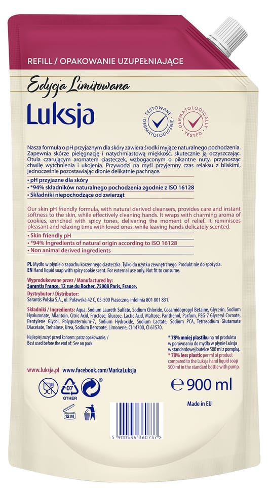 Mydło w płynie Luksja Korzenne Ciasteczko skutecznie oczyszcza skórę, zapewniając jej optymalną pielęgnację i natychmiastową miękkość. Otula aromatem ciasteczek doprawionych skórką pomarańczową i szczyptą korzennych przypraw. Ciepłe nuty zapachowe przywodzą na myśl przyjemny czas relaksu z bliskimi, jednocześnie pozostawiają dłonie wspaniale pachnące.