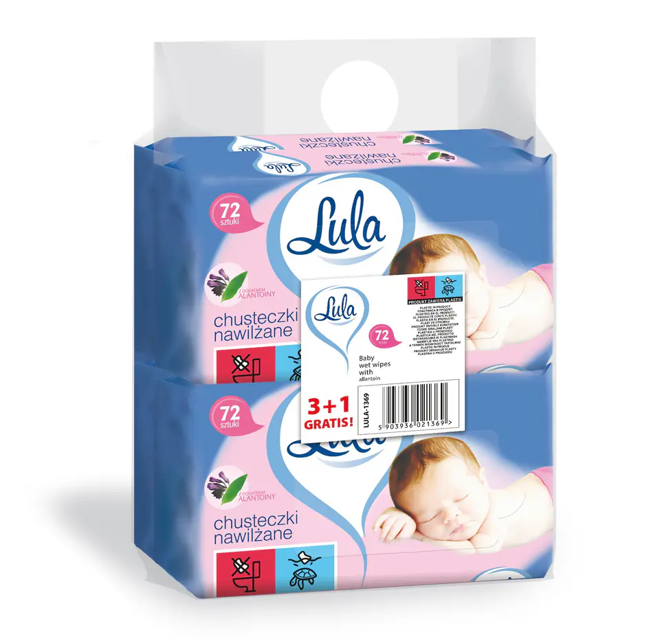 Miękkie i delikatne chusteczki nawilżane z dodatkiem alantoiny wspomagają ochronę i regenerację skóry. Chusteczki Lula dokładnie oczyszczają skórę dziecka pozostawiając ją gładką i nawilżoną, a kremowa formuła pielęgnuje i odżywia delikatną skórę niemowląt. Chusteczki nawilżane z alantoiną są szczególnie polecane dla skóry wrażliwej i skłonnej do alergii. Całkowicie bezpieczne, mają neutralne PH, nie zawierają parabenów, są przebadane chemicznie i mikrobiologicznie. Mogą być stosowane już od pierwszego dnia życia dziecka. Jednostka sprzedażowa - pakiet promocyjny (zgrzewka) - składa się z 4 opakowań, po 72szt chusteczek w każdym.