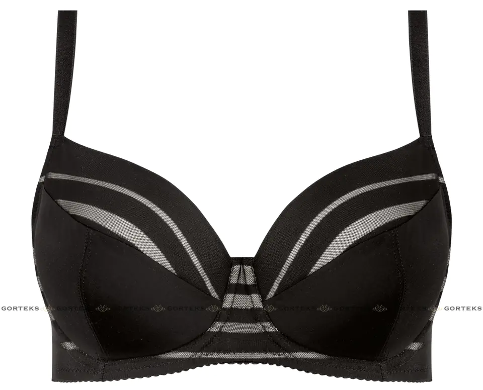 - Pionowe fiszbiny boczne stabilizują obwód biustonosza,