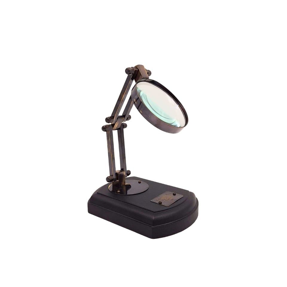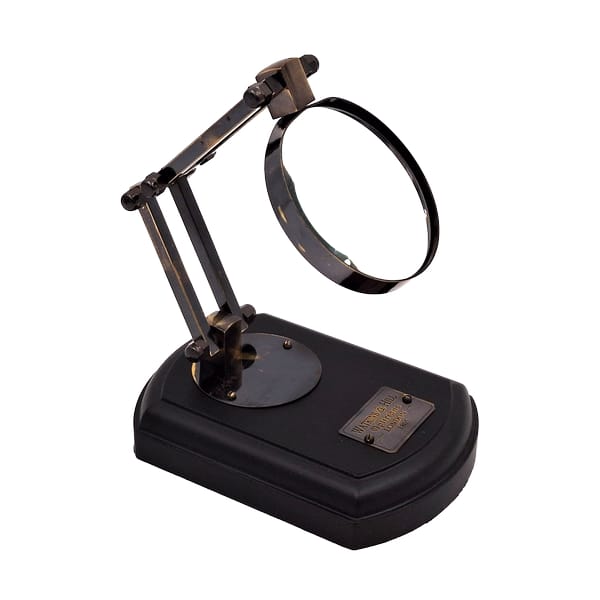 Lupa w oprawie mosiężnej - MG4ZS Lupa na drewnianej podstawie w stylu retro. Szkło powiększające na statywie doskonale sprawdzi się u wszystkich, którzy poza zoomem potrzebują również wolnych rąk do pracy, jak np. modelarze. Lupa na statywie to doskonały pomysł na prezent dla babci i dziadka, lub dla rodziców. Sprawdzi się również jako upominek dla modelarza i miłośnika stylu retro. Informacje o produkcie: Wymiary podstawy: 12,5 cm x 10 cm Średnica lupy: 7,5 cm Powiększenie 3,5x Podstawa drewniana Obudowa i ramię mosiężne Na podstawce tabliczka z napisem: W. Ottway, London, 1915