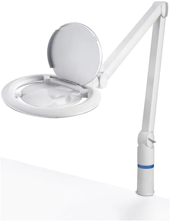 Wykonanie: pierścień oświetleniowy z 36 wysokowydajnymi diodami LED z optyką podstawową umożliwia optymalne skupienie światła. Lekka soczewka asferyczna z tworzywa PXM® z powłoką cera-tec®, odporna na złamanie, umożliwia uzyskanie ostrego obrazu, bez zniekształceń i bez cienia. Indywidualnie regulowana jasność. Niskie zużycie prądu (15W). Zacisk stołowy dla wielkości 18-74 mm. Soczewka zamienna z powiększeniem 2,5-krotnym.