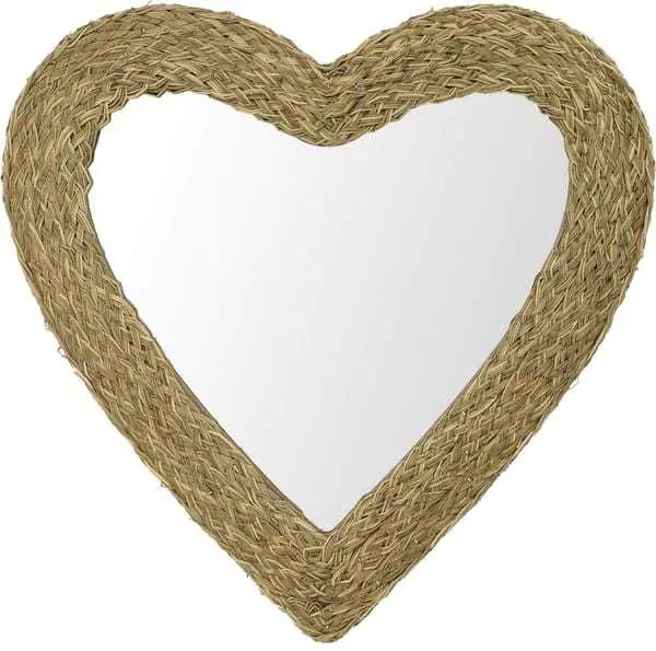 Lustro dekoracyjne Serce plecione trawą morską 62cm Lustro w kształcie Serca w stylu nowoczesnym. Idealnie wpasuje się do wnętrz wykonanych w stylu naturalnym lub eko. Lustro świetnie będzie prezentowało się na korytarzu bądź w sypialni. Dane techniczne: Wymiary: 62 cm, Materiał: trawa morska, lustro,