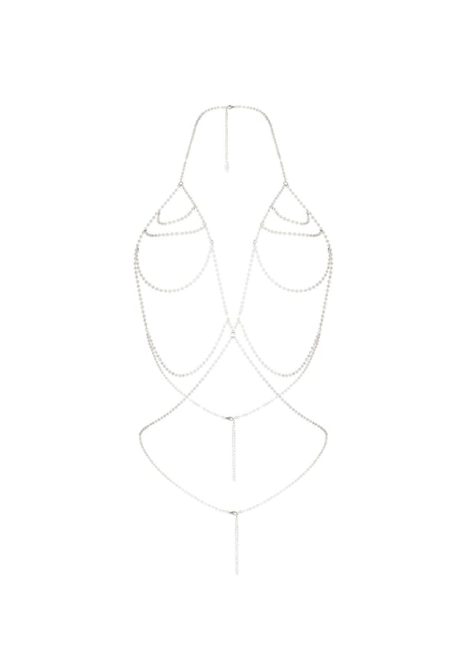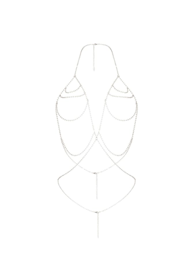 Biustonosz w stylu biżuteryjnym, wykonany z intrygującego splotu szklanych koralików.Delikatny układ łańcuszków tworzy lekki, subtelnie mieniący się efekt, który pięknie zdobi ciało.Projekt posiada trzy wygodne zapięcia, z których dwa umożliwiają regulację rozmiaru.Kolekcja Lyxa oferuje efektowny, dekoracyjny akcent do bielizny lub wieczorowych kreacji.Cechy produktu:– Lekka, dekoracyjna konstrukcja– Wykonany ze szklanych koralików i srebrnych łańcuszków– Regulowane zapięcia na szyi i w talii– Srebrne łączniki i detale– Zaprojektowany w UE– Materiały: 60% szkło, 35% miedź, 5% żelazoNieodpowiednie dla dzieci poniżej 3 lat ze względu na małe elementy, które mogą stanowić zagrożenie zadławienia.