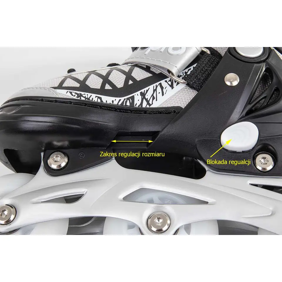 - można z nich korzystać przez cały rok dzięki funkcji 4w1 i kilka lat dzięki regulacji rozmiaru!prosta i szybka zmiana podstawy jezdnej zapewnią łatwy i bezproblemowy w montaż każdej opcjimleczne, świecące kółka PU LED zadbają o bezpieczeństwo i nowoczesny styloddychająca, półprzepuszczalna wewnętrzna membrana z pianki zapewni komfort jazdy przez cały dzieńregulacja i zapięcie w trzech miejscach ułatwią utrzymanie równowagi oraz mocno utrzyma stopę w buciewykonane z wysokiej jakości materiałów będą służyć przez wiele sezonówlekkie aluminiowe płozy zapewnią bezpieczne podparcie stopyspecjalny przycisk pozwoli na łatwą i szybką regulację rozmiarudołączone do płoz ochraniacze zadbają o ostrze łyżwyidealne na prezent dzięki kolorystyce, materiałowi i wzorom podążającymi za obowiązującymi trendami