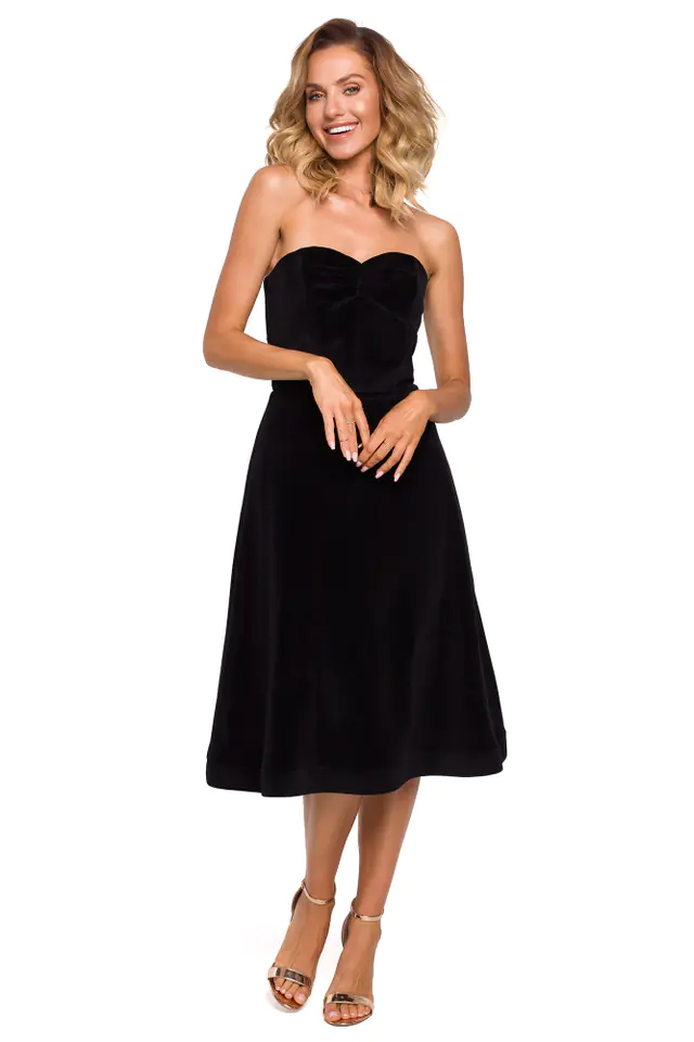 Odważna i romantyczna. Ta sukienka ma obie cechy. Usztywniony gorset podkreśli piersi i odsłoni ramiona oraz dekolt, rozkloszowany dół, usztywniony na dole taśmą nada jej wytwornego charakteru.