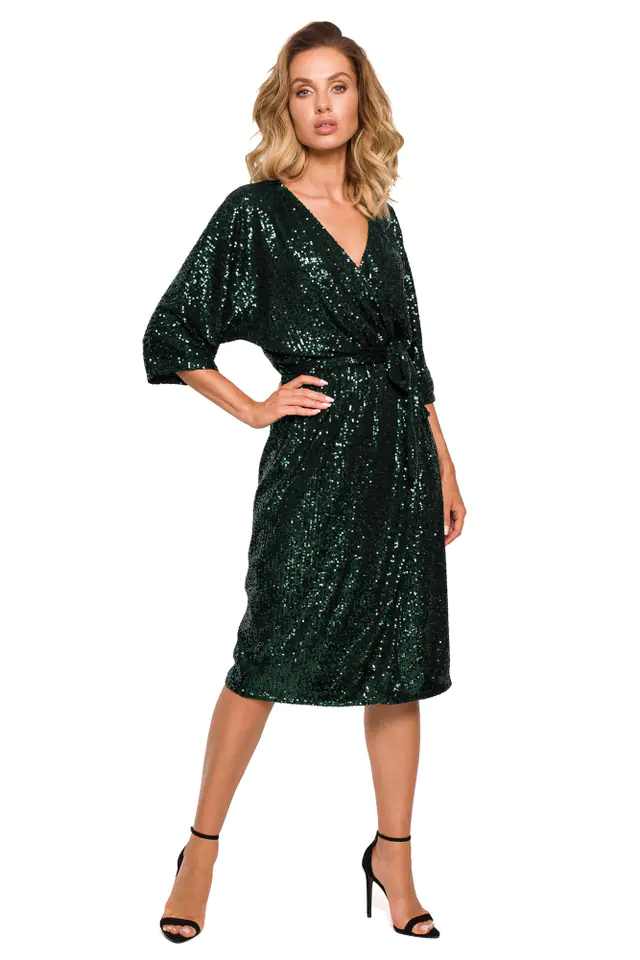 sukienka midi o fasonie kopertowym z kimonowymi rękawami długości do łokci