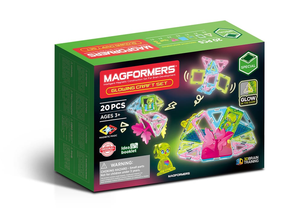 Magformers to klocki z wbudowanymi silnymi magnesami neodymowymi, które zawsze się przyciągają. Wystarczy zbliżyć do siebie ściankami dwa klocki, a one natychmiast ze sobą się połączą. Za pomocą klocków wzorowanych na kształt figur geometrycznych można zbudować wspaniałe trójwymiarowe budowle. W zabawie można korzystać z dołączonej do zestawu instrukcji lub własnej wyobraźni. W skład zestawu wchodzi 20 elementów: 6 świecących w ciemności trójkątów, 6 świecących w ciemności kwadratów oraz 7 innych elementów, które umożliwiają stworzenie niezwykłych konstrukcji.