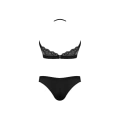 Komplet składa się z efektownego bandeau z wiązaniem typu halter oplatającym szyję oraz wygodnym zapięciem na haftki z tyłu. Dodatkowym atutem są starannie wykonane pasujące majtki z dekoracyjnymi, falbaniastymi wstawkami z koronki i klasycznym fasonem tyłu, ktore podkreślają elegancję oraz dopasowanie do sylwetki.