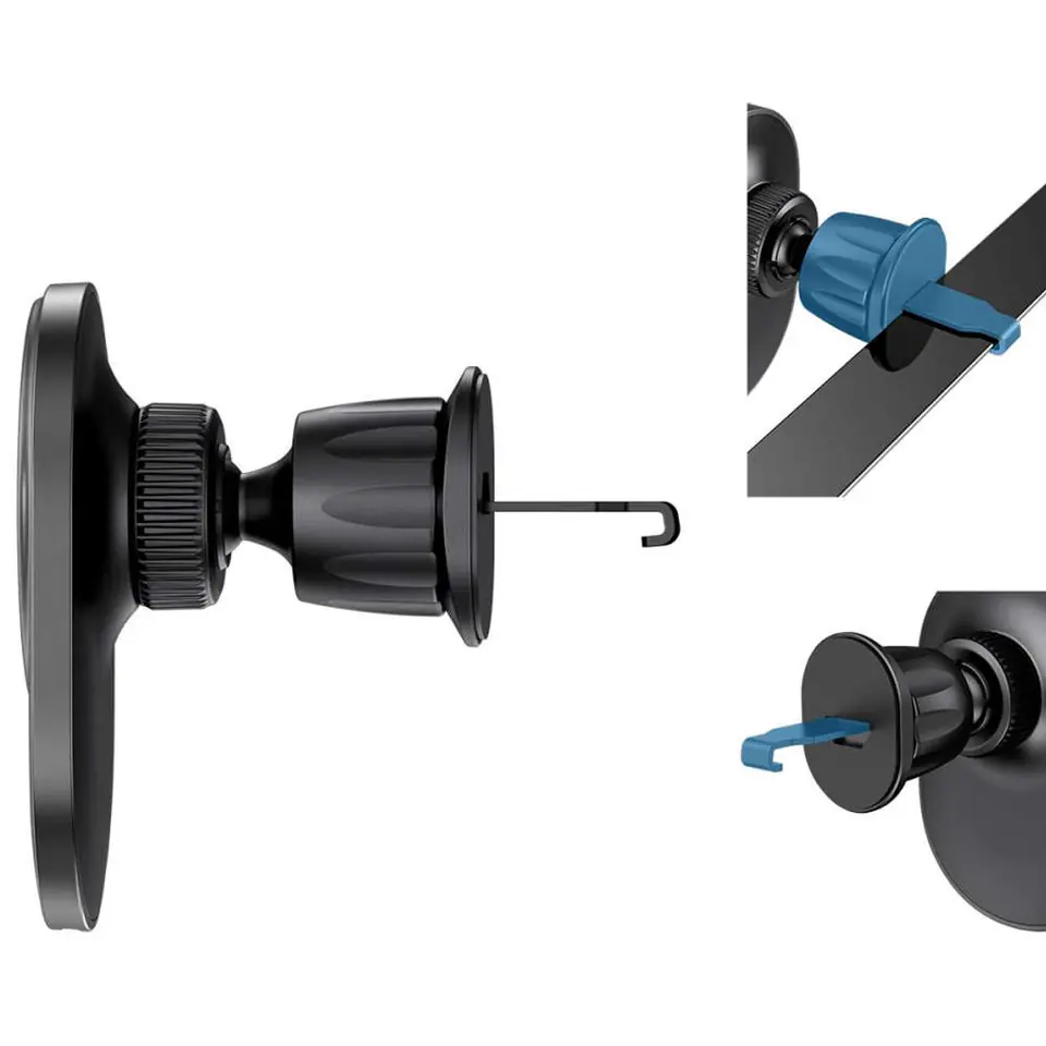 Haczykowaty zaczep montażowy, daje możliwość mocowania do dowolnej kratki w samochodzie.