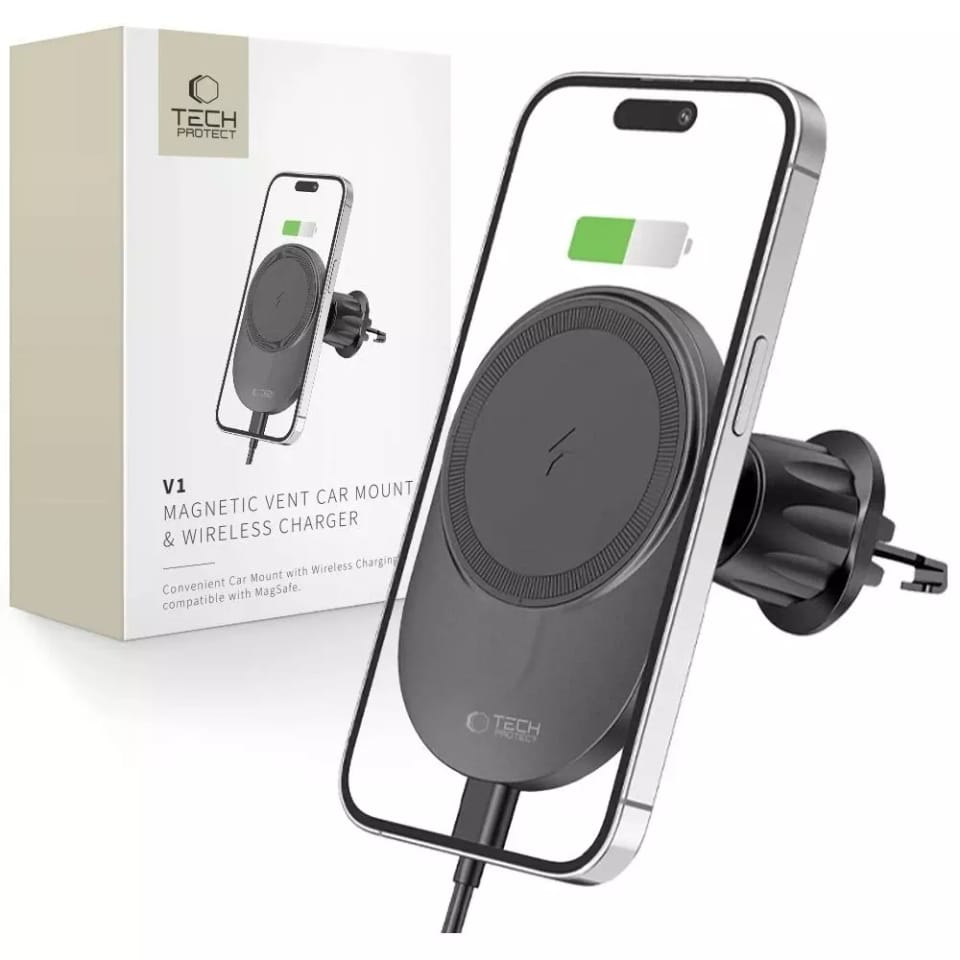 Tech-Protect MM15W-V1 czyli połączenie wygodnego uchwytu samochodowego oraz super szybkiej ładowarki bezprzewodowej obsługującej technologię MagSafe o maksymalnej mocy 15W.