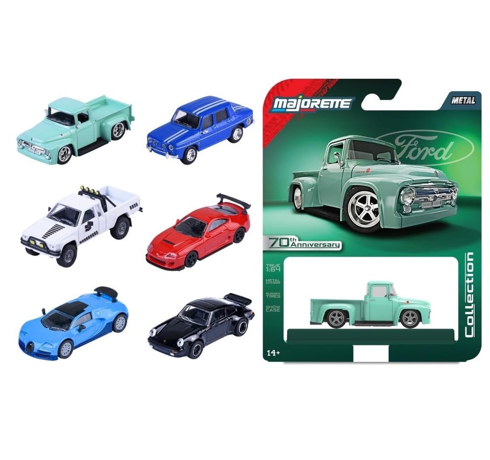 Majorette Pojazdy kolekcjonerskie, 6 rodzajów\nMetalowe pojazdy z metalowym podwoziem dla najbardziej wymagających kolekcjonerów. Wyposażone w koła z gumowymi oponami i realistycznymi felgami, klejnotowe reflektory oraz malowane boczne lusterka. W zestawie również specjalna gablota ekspozycyjna. Długość: 7,5 cm, skala 1:64, 3l+
