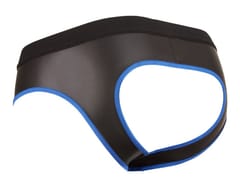 Męskie majtki z odkrytymi pośladkami z czarnego materiało podobnego do neoprenu. Otwory wykończone niebieską lamówką. Kolor: czarno-niebieski. Materiał: 60% poliuretan, 36% poliester, 4% elastan.
