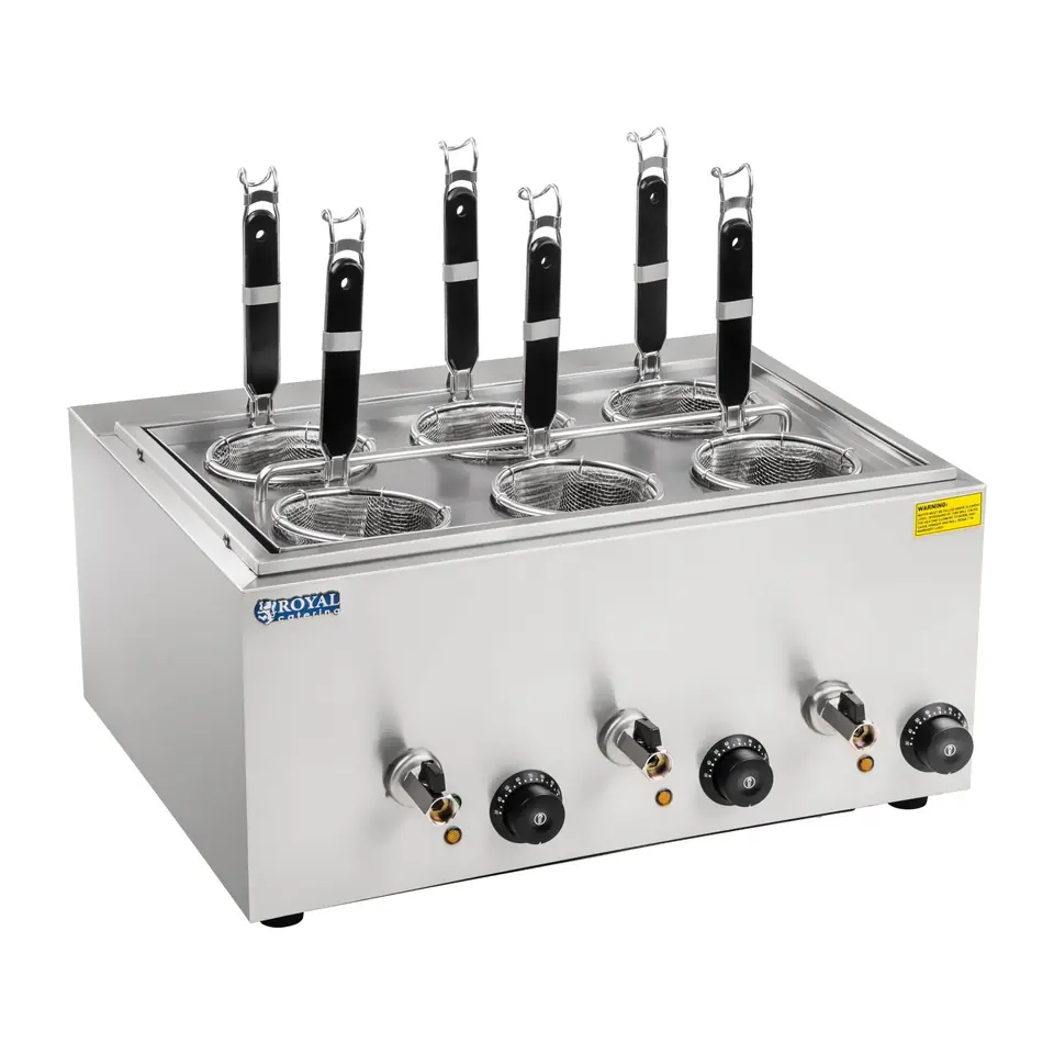 Nazwa producenta: RCNK-6 Profesjonalny warnik gastronomiczny do gotowania makaronu oraz pierogów. Bez problemu poradzi sobie z gotowaniem zamrożonych potraw.Wykonany w całości ze stali nierdzewnej, posiada trzy oddzielne komory z kranikami do spuszczania wody oraz oddzielnym sterowaniem temperatury. Dzięki takiemu rozwiązaniu można jednocześnie przygotowywać potrawy o różnych smakach oraz jedną komorę wykorzystywać do gotowania a pozostałe z inną temperaturą do podgrzewania już gotowych potraw.Koszyki wykonane są ze stalowej siatki o drobnych oczkach które pozwalają na gotowanie bardzo drobnego i cienkiego makaronu spaghetti, tortellini czy tagliatelle.Pojemniki z wodą są przykryte pokrywą z otworami na koszyki CO ZNACZNIE OGRANICZA PAROWANIE I UBYTEK WODY. Cechy i funkcje: