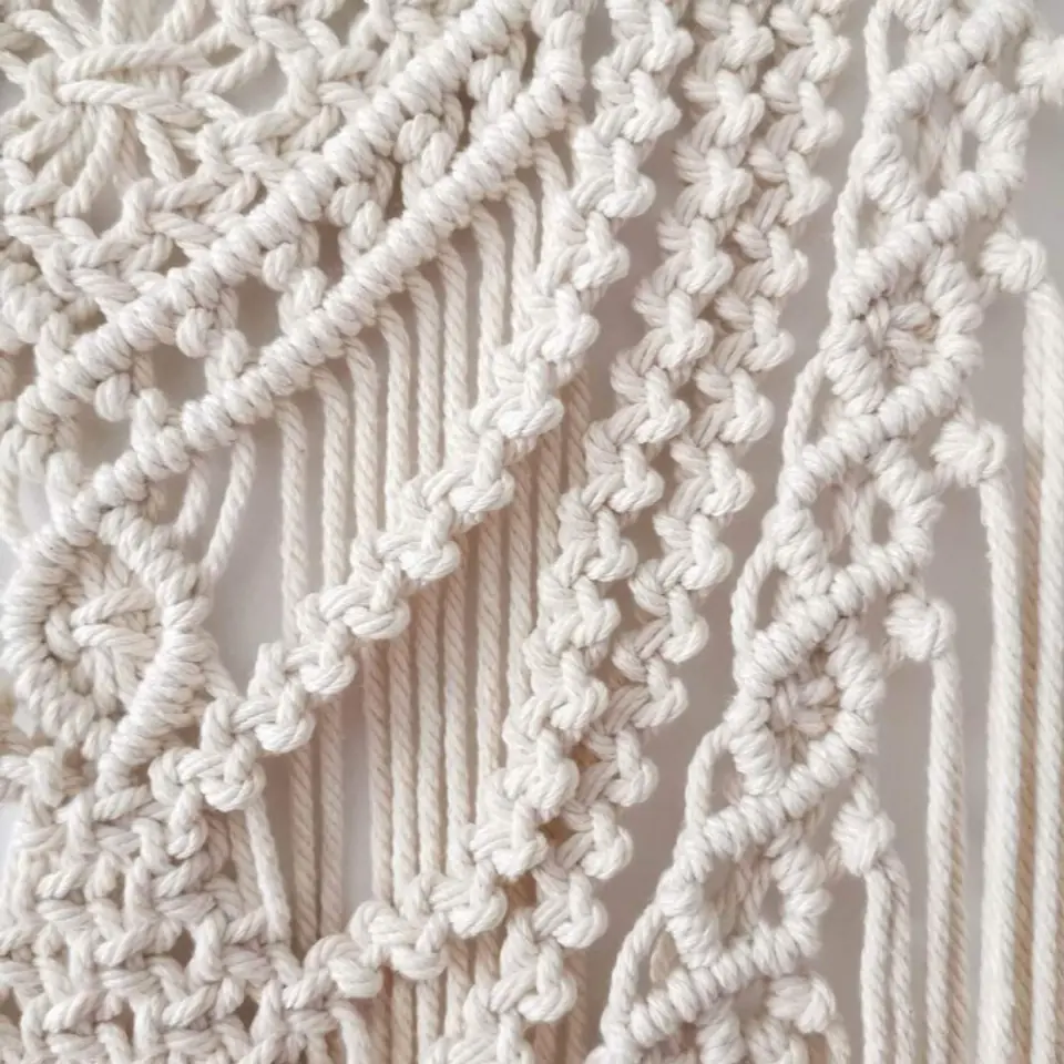 Piękna makrama w klimacie boho pasująca do wielu wnętrz Ozdoba możliwa również do zastosowania do sesji fotograficznych czy jako dekoracja przy wielu tematycznych uroczystościach Makrama wyplatana z bawełnianego sznurka plecionego o grubości 5 mm. Wymiary:- szerokość kijka 41 cm- wysokość od kijka 80 cm