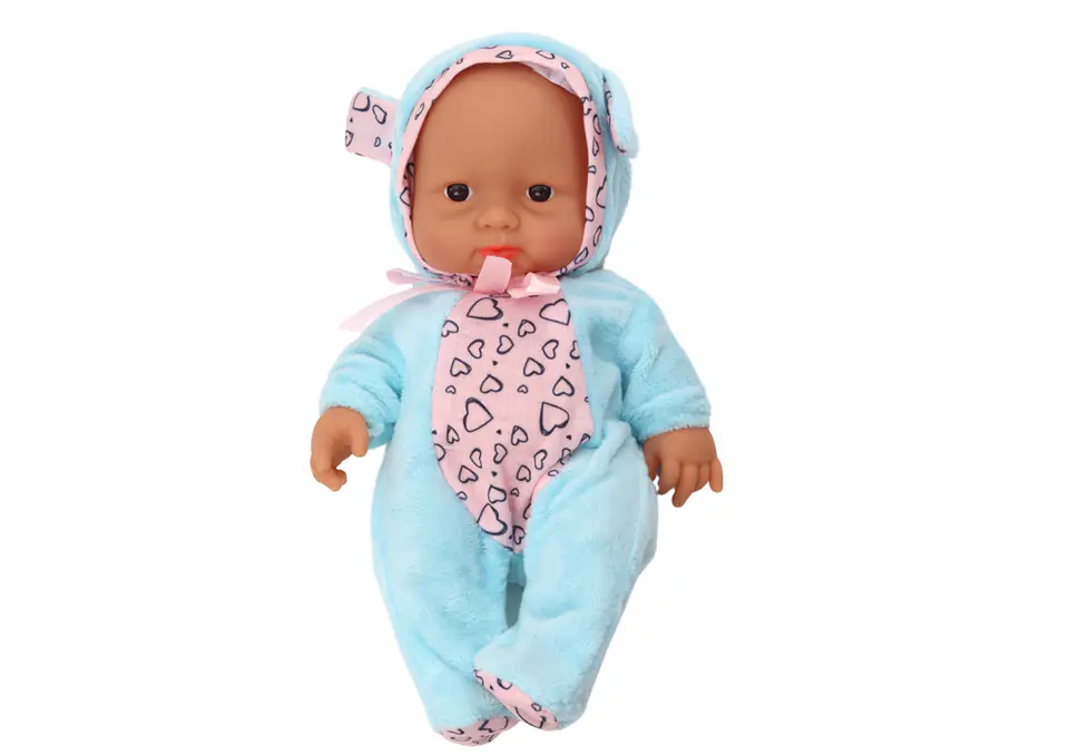 Urocza mała laleczka bobas! Ta niewielkich rozmiarów laleczka o wymiarach 21cm x 14cm to idealny towarzysz dla każdej małej dziewczynki. Jest ubrana w urocze niebieskie ubranko ozdobione serduszkami, które dodają jej uroku i słodkiego wyglądu.