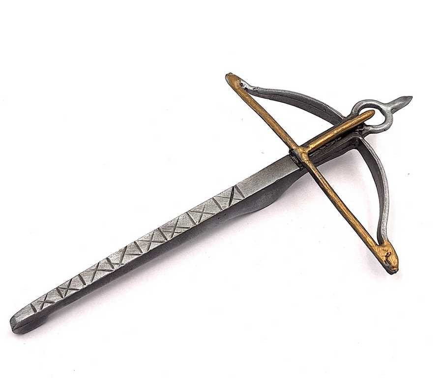 Mała Metalowa Replika Kuszy – Dekoracja – BM Materiał: Metal Kolor: Srebrny, złoty Wymiary: długość 14cm, szerokość 8,5 cm