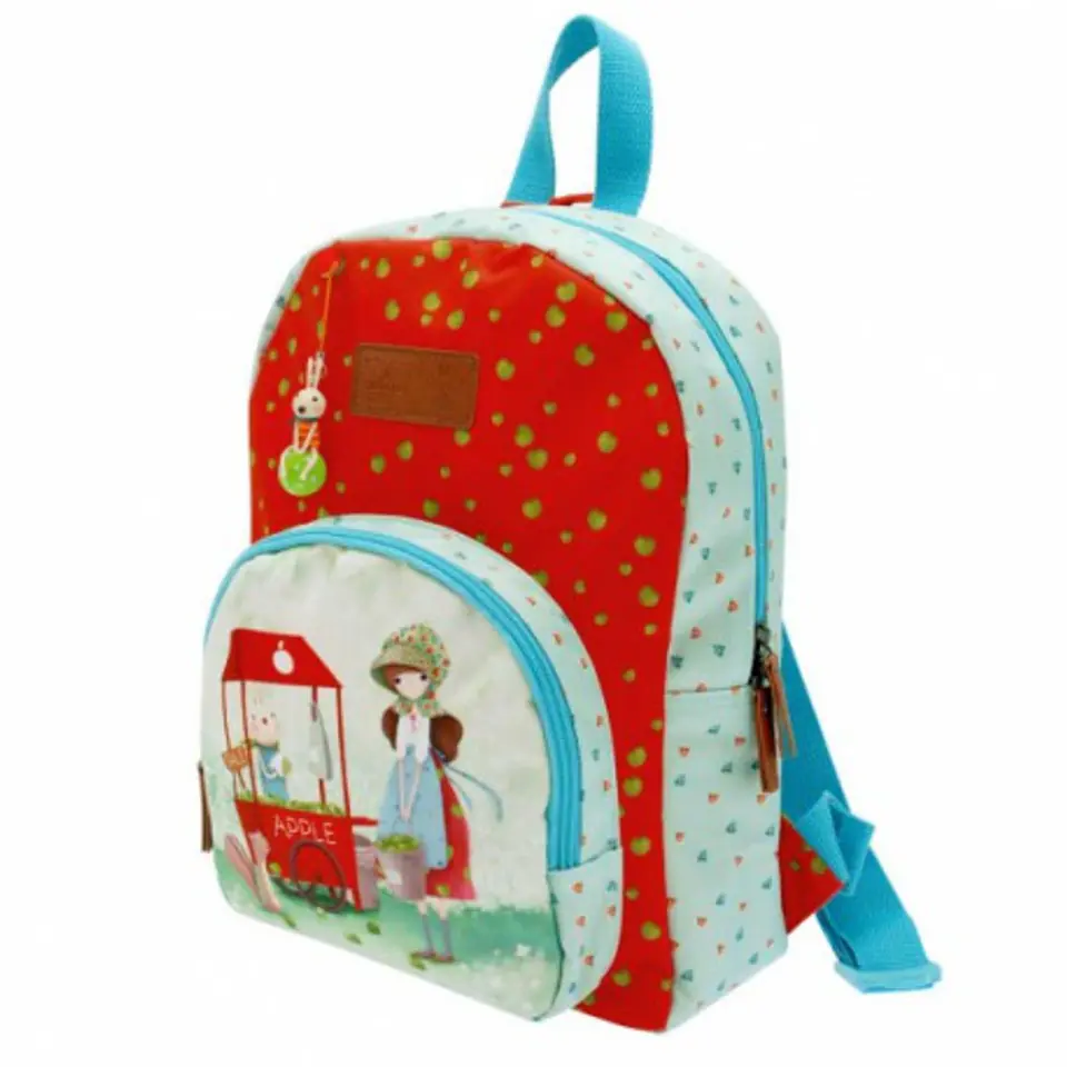 Maly plecak - Kori Kumi - An Apple A Day Uroczy mały plecak dla każdej marzycielki W części głównej kieszonka na telefon oraz kieszeń z suwakiem. Z przodu mniejsza kieszeń. Obie części zabezpieczone suwakiem. Plecak posiada zawieszkę z królikiem. Paski na ramiona wykonane z miękkiego materiału. Można regulować ich długość. Uwaga: każda sztuka jest wykonana ręcznie, kolory oraz detale mogą się różnić. Materiał zewnętrzny : poliester, podszewka : poliester , wykończenie : poliuretan. Zabawka jest przeznaczona dla dzieci powyżej 3 roku życia. 569KK02