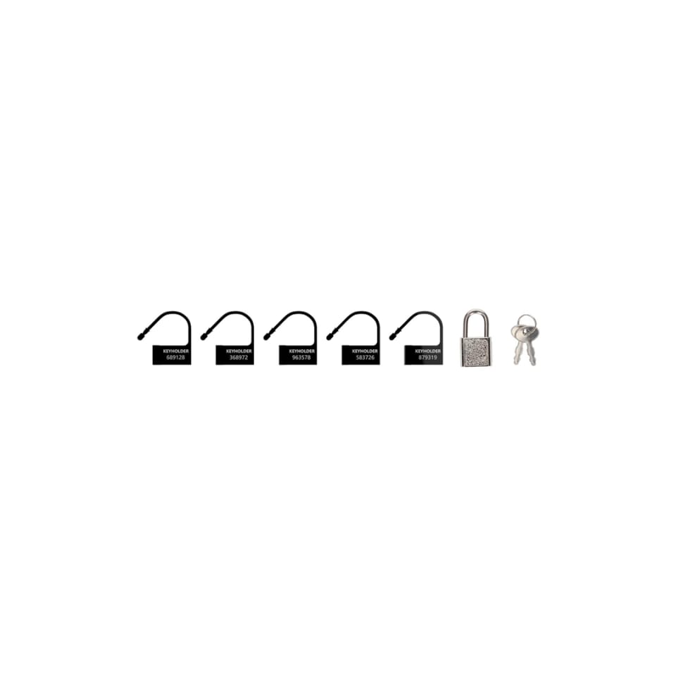 W komplecie znajduje się 5 białych, lekkich zamkow jednorazowych wykonanych z wytrzymałego tworzywa oraz solidny metalowy zamek wielokrotnego użytku wraz z kluczem, zapewniający jeszcze większy poziom zabezpieczenia. Zamki są kompatybilne z większością klatek intymnych marki ManCage oraz innymi modelami posiadającymi odpowiedni system zamknięcia.