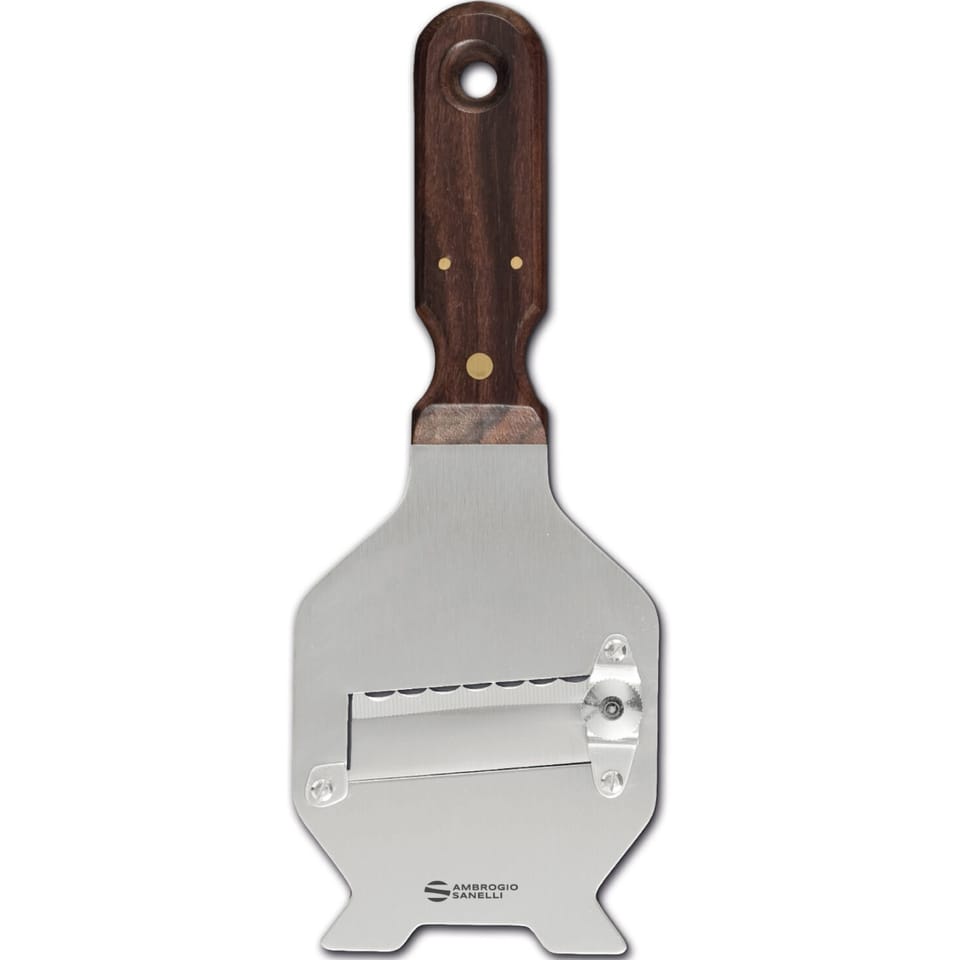 Kod producenta: 1721.000Mandolina marki Ambrogio Sanelli to profesjonalne akcesorium, które sprawdzi się w każdej kuchni do krojenia w cienkie plastry trufli, warzyw, serów czy czekolady. Posiada ząbkowane ostrze wykonane z wysokiej jakości stali nierdzewnej AISI 420 o twardości 55 HCR. Obudowa ostrza została wykonana ze stali nierdzewnej AISI 430. Stylowy uchwyt wykonany został z wytrzymałego drewna różanego. Ostrze regulowane jest za pomocą śruby. Grubość cięcia plastrów wynosi od 0.2 do 3 mm.Cechy produktu:
