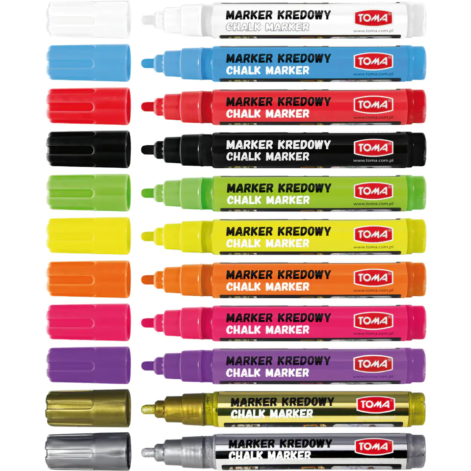 Marker z plynną kredą jest idealny do pisania po tablicach czarnych, bialych, powierzchniach szklanych oraz plastikowych.