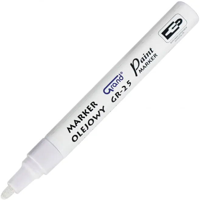 Marker olejowy marki Grand idealnie sprawdzi sie pisania po stali, gumie, drewnie, plastiku i szkle. Niezwykle trwaly, oporny na warunki atmosferyczne takie jak woda czy promienie UV.