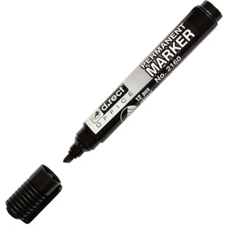 Permanentny marker z wodoodpornym, nietoksycznym, szybkoschnącym tuszem. Przeznaczony do pisania po róznych powierzchniach np. papierze, kartonie, metalu, drewnie, szkle i plastiku. Ścieta koncówka pozwala na prowadzenie linii róznej grubości.