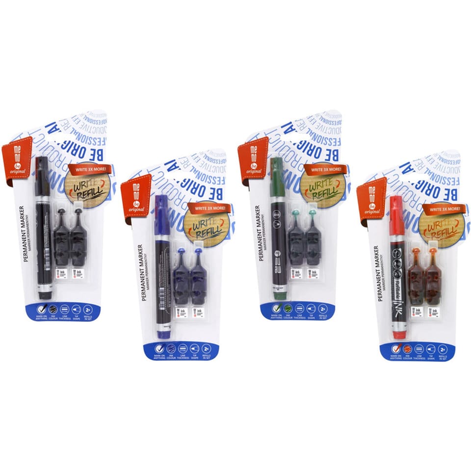 * marker permanentny MEMOBE * doskonale nadaje się do wykonywania napisów, oznaczeń i dekoracji na większości gładkich powierzchni * trwały tusz na bazie alkoholu jest odporny na ścieranie * okrągła końcówka * grubość linii pisania: 2-3 mm * skuwka ze specjalną końcówką ułatwiającą rozcinanie taśmy, otwieranie kartonów i uzupełnianie tuszu * marker nadaje się do ponownego uzupełnienia dedykowanym do tego, załączonym tuszem, dzięki czemu jest bardziej ekologiczny i ekonomiczny * zatyczka z klipsem wyposażona jest w specjalny ząbek, który ułatwia czyste i komfortowe napełnienie * w opakowaniu: marker, 2 ampułki z tuszem * sposób uzupełniania: za pomocą ząbka w zatyczce delikatnie podważyć zabezpieczenie w górnej części markera - przed otwarciem ampułki delikatnie nią wstrząsnąć - ostrożnie otworzyć ampułkę i wlać całą zawartość do markera - zamknąć szczelnie zabezpieczenie i pozostawić zamknięty marker końcówką do dołu - po chwili marker znów jest gotowy do użycia * kolory: czarny, niebieski, zielony, czerwony * jednostka sprzedaży 1 opakowanie * marka MemoBe została założona w 1993 roku i dzięki intensywnemu rozwojowi zajmuje kluczowe miejsce wśród producentów z branży artykułów biurowych i szkolnych w Polsce, każdy produkt MemoBe to gwarancja wysokiego komfortu pracy podczas codziennego użytkowania, w produkcji wykorzystywane są tylko materiały wysokiej jakości