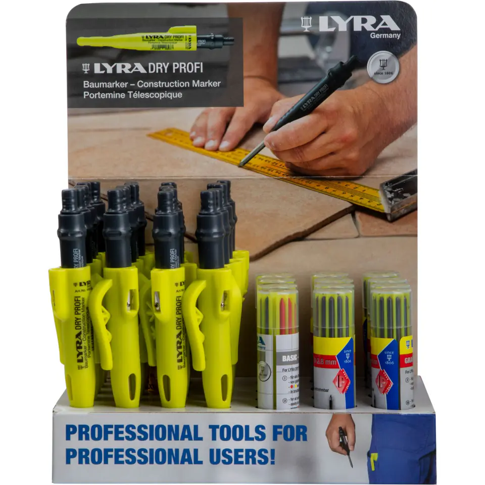 Display kartonowy z markierami budowlanymi i kompletami wkładów wymiennych. Markery konstruktorskie, wysokiej jakości, metalowe końcówki, automatyczne na wkłady z zintegrowanymi ostrzałkami. Wkłady o średnicy Ø 2.8mm, końcówki metalowe o średnicy Ø 5mm i długości 46mm. Wkłady grafitowe i kolorowe nadające się do pisania i znakowania na powierzchniach: kamieniu, betonie, drewnie suchym, metalu (nie gorącym), plastiku, płytkach ceramicznych i szkle. Ścieralne za pomocą mokrej szmatki.