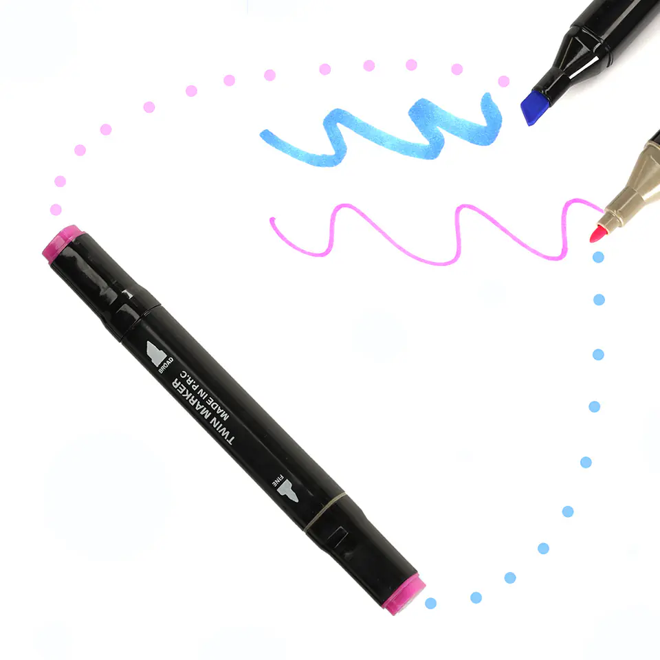 Każdy marker ma dwie końcówki, szeroką – idealną do zamalowywania większych powierzchni oraz cienką – do tworzenia cienkich i bardziej precyzyjnych linii, aby dopracować szczegółów. Odpowiednio dobrana końcówka zapewni szczegółowość rysunku lub lepsze jego pokrycie.