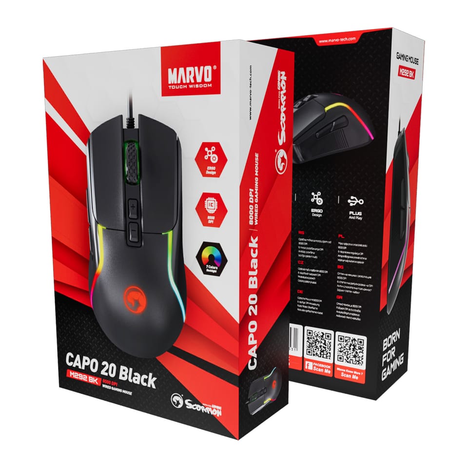 Marvo CAPO 20 to zaawansowana mysz stworzona z myślą o graczach, którzy oczekują od swojego sprzętu nie tylko niezawodności, ale też precyzji, szybkiej reakcji oraz wysokiej wytrzymałości. Dzięki zastosowaniu sprawdzonego sensora optycznego i ergonomicznej konstrukcji, urządzenie gwarantuje komfort nawet podczas wielogodzinnych sesji gamingowych. Stylowe podświetlenie RGB w 7 kolorach dopełnia gamingowy charakter myszki, czyniąc ją nie tylko funkcjonalnym, ale też atrakcyjnym wizualnie elementem zestawu gracza.