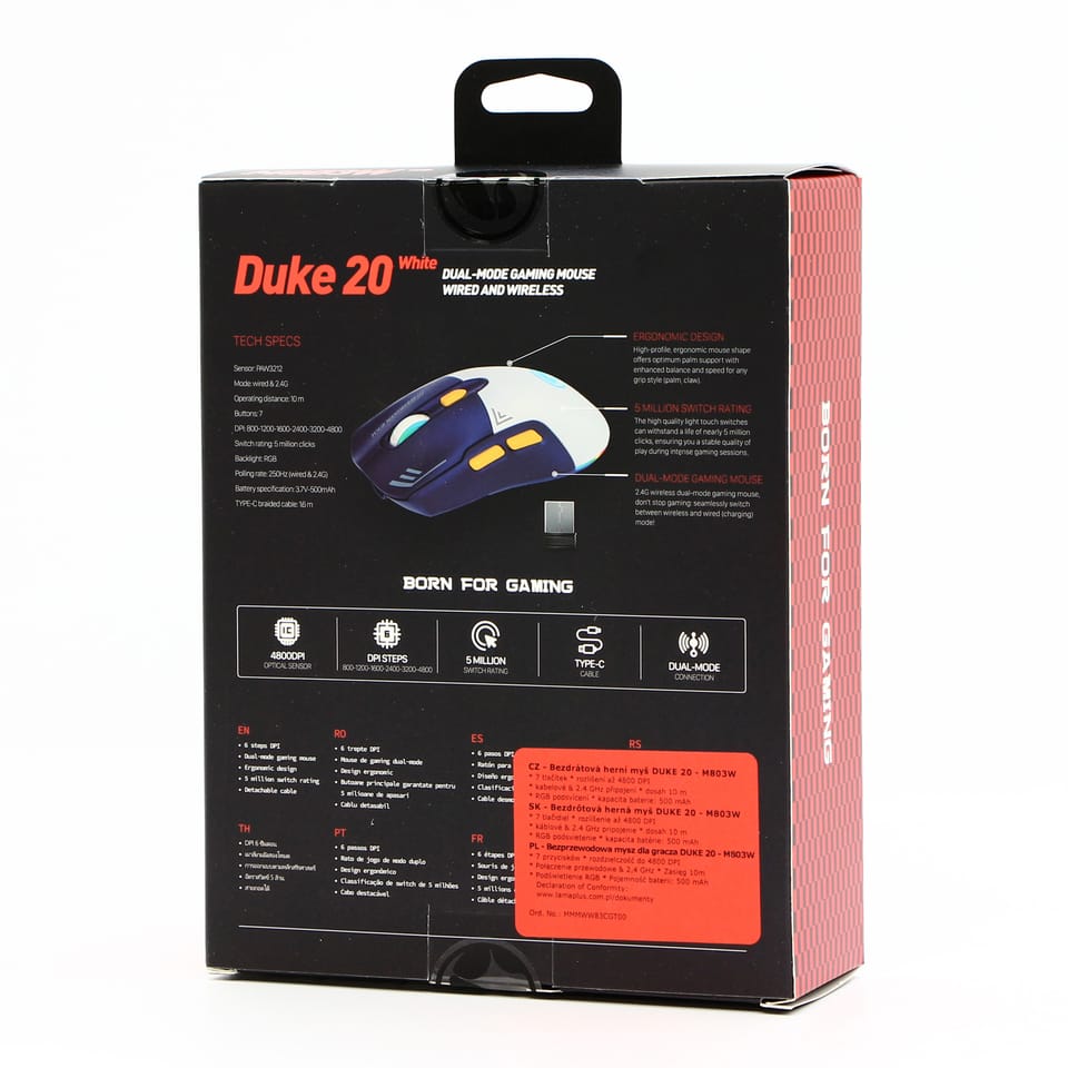 Marvo Duke 20 to wszechstronna mysz gamingowa, która łączy zalety przewodowego i bezprzewodowego połączenia, oferując graczom elastyczność i niezawodność. Dzięki zaawansowanemu sensorowi, regulowanemu DPI, efektownemu podświetleniu RGB oraz długiej żywotności, mysz Duke 20 staje się idealnym narzędziem zarówno dla profesjonalnych, jak i rekreacyjnych graczy.