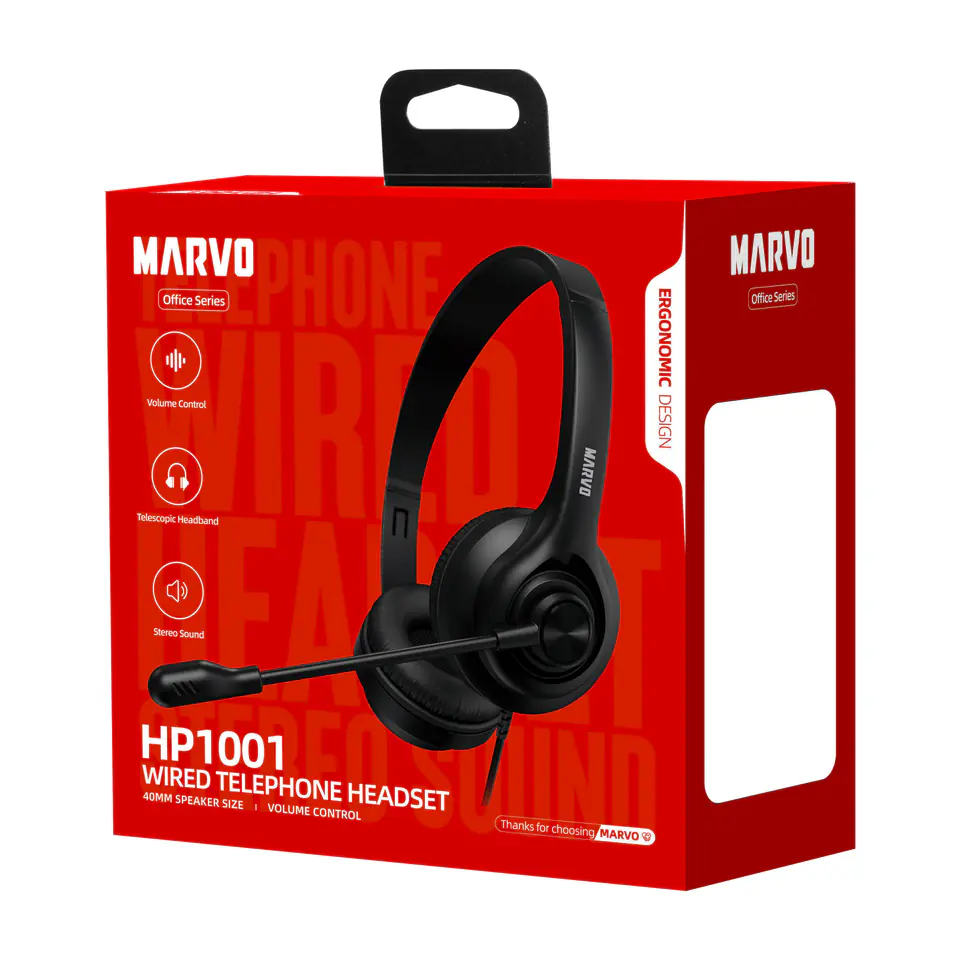 Słuchawki Marvo HP1001Słuchawki HP1001 producenta Marvo idealnie nadają się do telekonferencji i spotkań online, niezależnie od tego, czy pracujesz w domu, czy w biurze.Te słuchawki zapewniają wspaniałe wrażenia dźwiękowe i komfort, których potrzebujesz do produktywnej i wydajnej komunikacji na duże odległości.Dzięki głośnikom o średnicy 40 mm i impedancji 32 ? słuchawki te zagwarantują doskonałą jakość dźwięku oraz czysty i zrozumiały głos.Dzięki czułości głośników wynoszącej 118 dB uchwycisz każdy szczegół głosów swoich współpracowników lub partnerów biznesowych, co jest kluczowe dla efektywnej współpracy online.Zestaw słuchawkowy HP1001 wyposażony jest w mikrofon o średnicy 6*5 mm i czułości -42 dB, co zapewnia czysty i zrozumiały dźwięk Twojego głosu dla innych uczestników telekonferencji.Dzięki impedancji mikrofonu wynoszącej 2,2 K? będziesz słyszany wyraźnie i wyraźnie nawet w ruchliwym otoczeniu.Kabel o długości 1,9 m poprawia komfort użytkowania. Regulacja głośności na słuchawce pozwala na łatwą regulację.Zestaw słuchawkowy Marvo HP1001 to doskonały wybór dla każdego, kto potrzebuje niezawodnego zestawu słuchawkowego wysokiej jakości do telekonferencji i spotkań online.Dzięki doskonałemu dźwiękowi i wygodnemu projektowi będziesz mógł bez żadnych problemów skutecznie komunikować się i współpracować ze swoimi współpracownikami i partnerami biznesowymi na odległość. Dane techniczne:Dźwięk: stereofonicznyZakres częstotliwości: 20 - 20 000 HzŚrednica głośnika: 40 mmImpedancja: 32? ± 15%Czułość głośnika: 112 dB ± 3 dBMateriał kolczyków: Skóra ekologicznaTyp mikrofonu: 360° dookólny – elastycznyMoc: 20 mWCzułość mikrofonu: -42dB ± 3dBOdłączany mikrofon: NieRegulacja głośności: na słuchawcePołączenie: gniazdo 2 x 3,5 mmDługość kabla: 1,7 mKompatybilny z: Windows, MACWymiary: 162 x 165 x 57 mmWaga: 111 gCzarny kolor