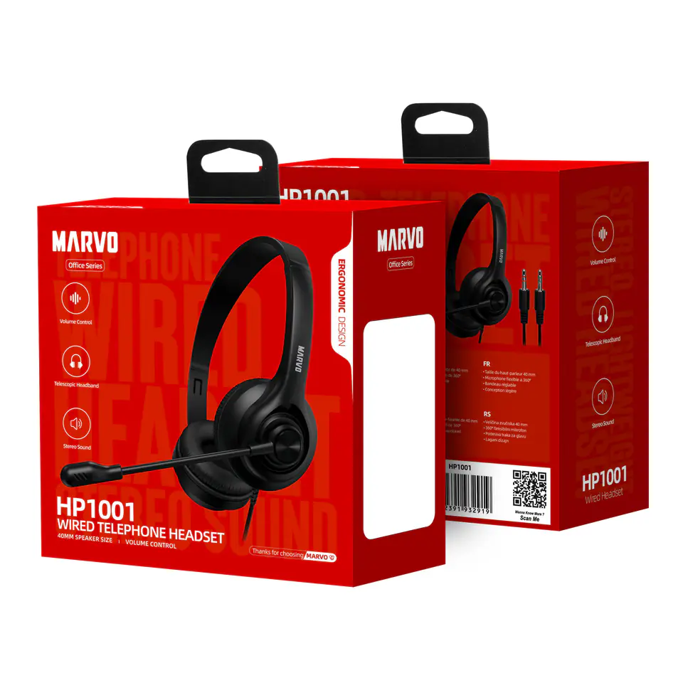 Marvo HP1001 słuchawki z mikrofonem, przewodowa, czarna, 2 x 3.5 mm Jack
