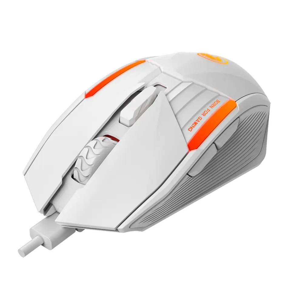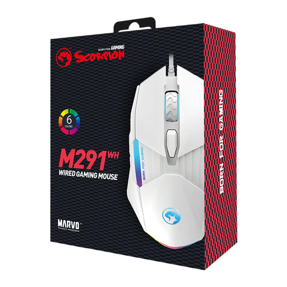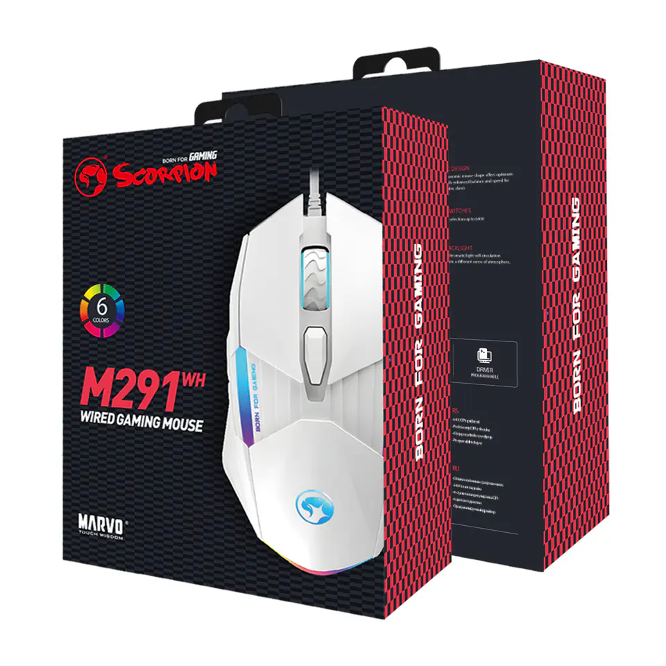 Mysz do gier Marvo M291 WHMamy tu nowość w kolorach Marvo i jest to mysz gamingowa M291. W myszce zastosowano atrakcyjny biały kolor oraz klasyczne logo Scorpion. Ta biała piękność ma regulowane DPI w zakresie 1000-1600-3200-6400, dokładnie dla rodzaju gier, które kochasz. FPS, MOBA, bądź RPG. Możesz dostosować DPI do każdej gry, a 6 w pełni programowalnych przycisków zapewni ci przewagę nad przeciwnikiem, gdy wybierzesz kombinacje klawiszowe i skróty, spersonalizowane do twoich potrzeb.Czujnik optyczny działa na niemal każdej powierzchni, z której korzystają współczesne podkładki, a kabel w oplocie gwarantuje, że pozostanie on w pełni funkcjonalny nawet po latach użytkowania. Przełączniki myszy wytrzymują do około 3 milionów kliknięć. Oczywiście podświetlenie RAINBOW, które oferuje aż 6 efektów monochromatycznych dla każdego rodzaju rozgrywki i intensywności użytkowania. Ergonomiczna konstrukcja to oczywistość, a połączenie przez USB 2.0 za pomocą kabla o długości 1,4 m nigdy nie było łatwiejsze. ParametryCzujnik: SPCP193Typ przełącznika: Huanyu - do 3 milionów kliknięćLiczba przycisków: 6Programowalne przyciski: takWbudowana pamięć: nieMaks. DPI: 6400Opcja DPI: 1000 - 1600 - 3200 - 6400Maksymalna prędkość śledzenia: 250 IPSRegulowane DPI: TakMakro: TakPodświetlenie: Tak, 6 efektówMożliwość wyłączenia podświetlenia: TakOdpowiedź: 125 HzWaga: 72 gWymiary: 125 x 69,5 x 42 mmDługość kabla USB: 1,4 mOprogramowanie: TakObsługa systemu Windows: 7/8/10/11Gwarancja: 2 lata