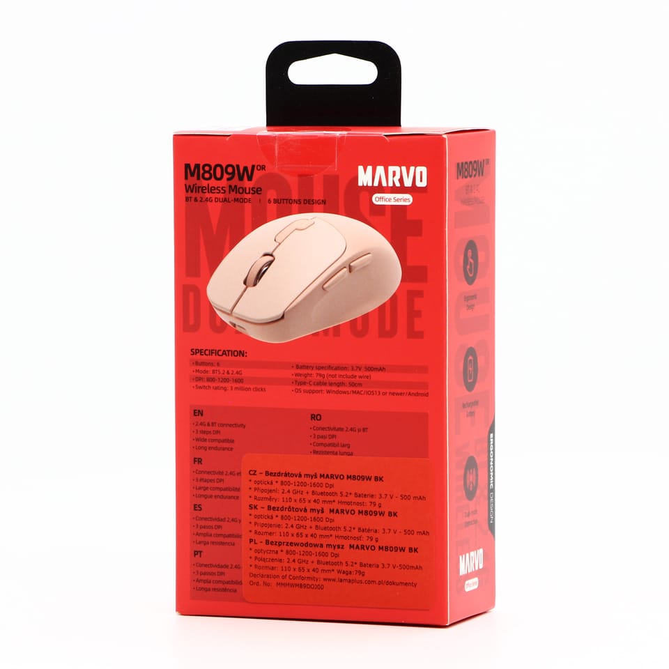 Mysz Marvo M809W oferuje dwa sposoby połączenia: Bluetooth 5.2 oraz 2.4 GHz poprzez odbiornik USB. Zasięg do 10 metrów zapewnia stabilne i niezawodne połączenie zarówno w biurze, jak i w podróży. Możesz szybko przełączać się między trybami i korzystać z myszy na różnych urządzeniach, takich jak laptop, tablet czy komputer stacjonarny, bez konieczności używania kabli. Instalacja jest intuicyjna dzięki technologii Plug & Play – wystarczy podłączyć odbiornik USB lub sparować urządzenie przez Bluetooth, by natychmiast rozpocząć pracę.