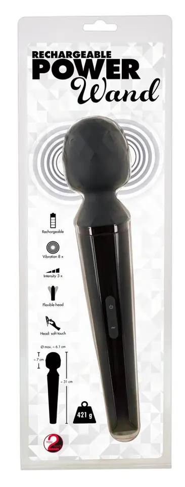 For full-body massages and precise stimulation!Rechargeable massage wand with a large, movable head made out of silicone. The 24 vibration modes provide sensual moments of pleasure. Can be controlled easily at the push of a button. Comes with a USB charging cable.Complete length 31 cm, O 6.1 cm. Silicone with a PU coating, ABS.
