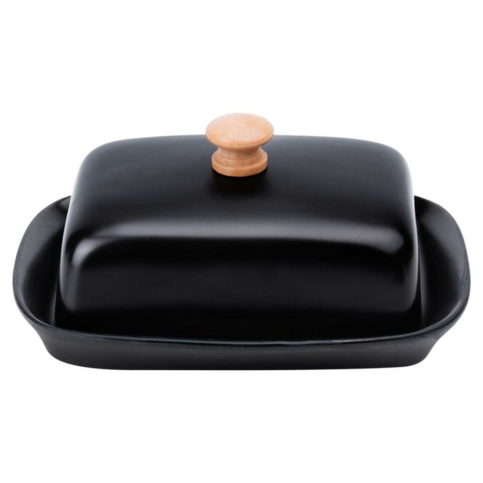Maselniczka wykonana z ceramiki w czarnym kolorze z drewnianym uchwytem. Idealna do przechowywania i serwowania masła.