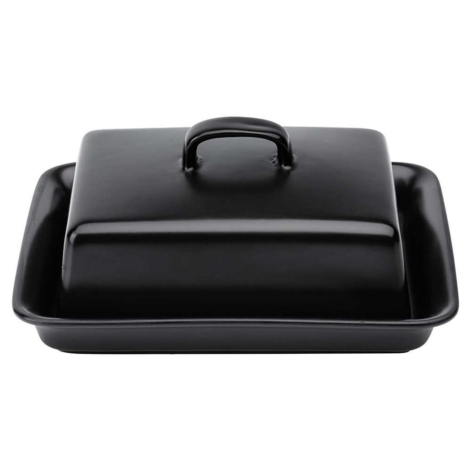 Maselniczka wykonana z ceramiki w czarnym kolorze z praktycznym uchwytem. Idealna do przechowywania i serwowania masła.