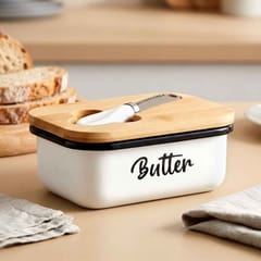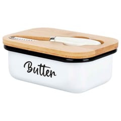 Maselniczka wykonana z metalu w kolorze białym z bambusową pokrywką oraz napisem Butter. Idealna do przechowywania i serwowania masła. W zestawie z nożykiem.