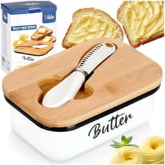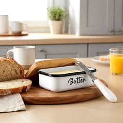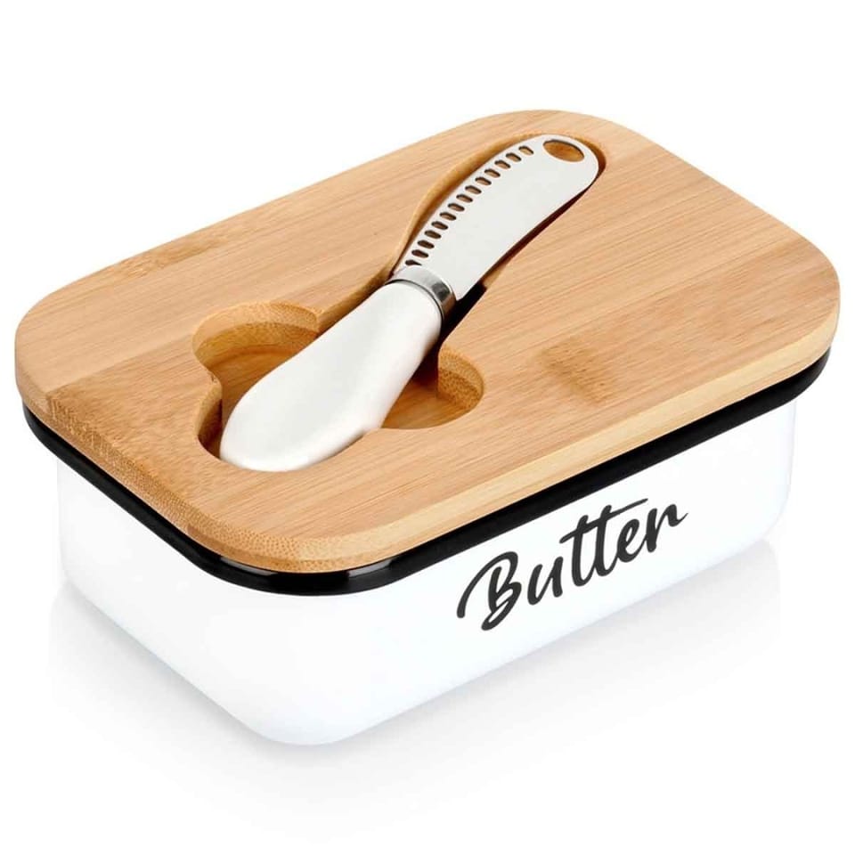 - Modny design - Wykonana z najwyższej jakości metalu w białym kolorze z czarnym napisem Butter. Prezentuje się bardzo elegancko, dzięki bambusowej pokrywce. Maselniczka posiada klasyczny kształt, więc będzie pasowała do wyposażenia każdej kuchni, a postawiona na stole pasuje do każdej zastawy. Utrzymana w modnym kolorze.