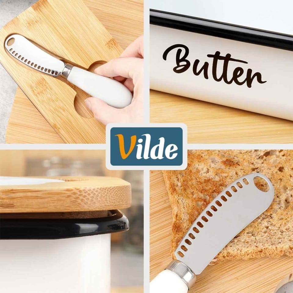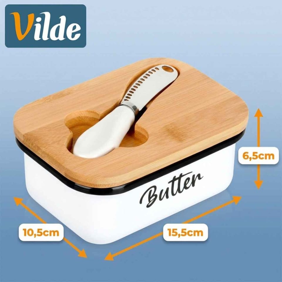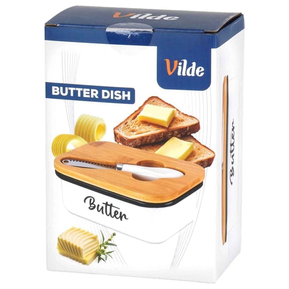 Przydatna maselniczka w zestawie z nożykiem, która sprawdzi się do przechowywania oraz serwowania masła. Posiada praktyczne przykrycie. Wykonana z materiałów bezpiecznych dla zdrowia i neutralnych dla żywności. Klasyczny wzór sprawi, że będzie pięknie prezentować się z każdą zastawą stołową. Przydatna w każdym domu. Oryginalny produkt marki Vilde. Wyprodukowano zgodnie z europejskimi standardami.