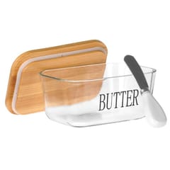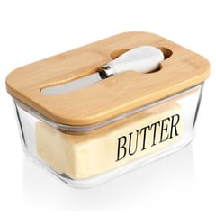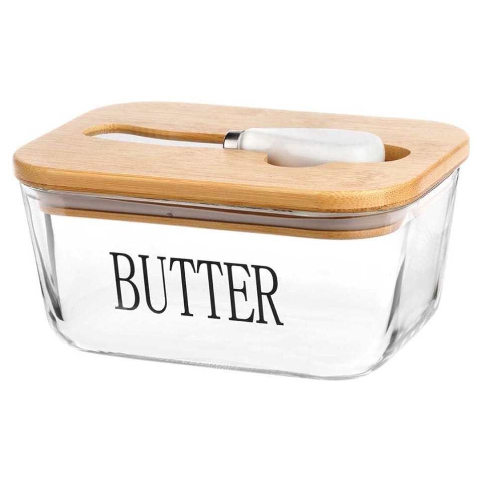 Maselniczka wykonana z przezroczystego szkła z bambusową pokrywką oraz napisem Butter. Idealna do przechowywania i serwowania masła. W zestawie z nożykiem.