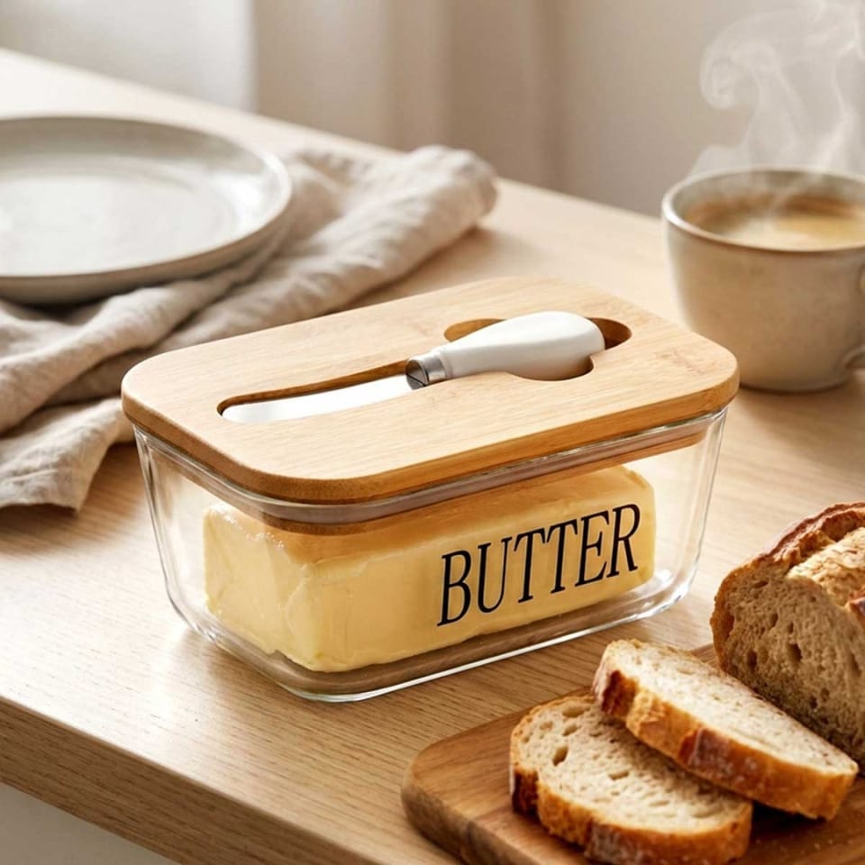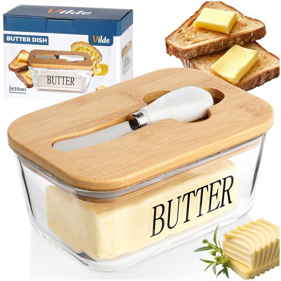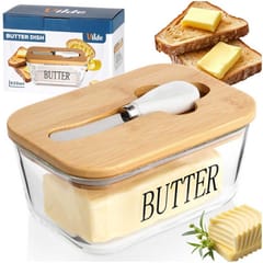 - Modny design - Wykonana z najwyższej jakości szkła w przezroczystym kolorze z czarnym napisem Butter. Prezentuje się bardzo elegancko, dzięki bambusowej pokrywce. Maselniczka posiada klasyczny kształt, więc będzie pasowała do wyposażenia każdej kuchni, a postawiona na stole pasuje do każdej zastawy. Utrzymana w modnym kolorze.