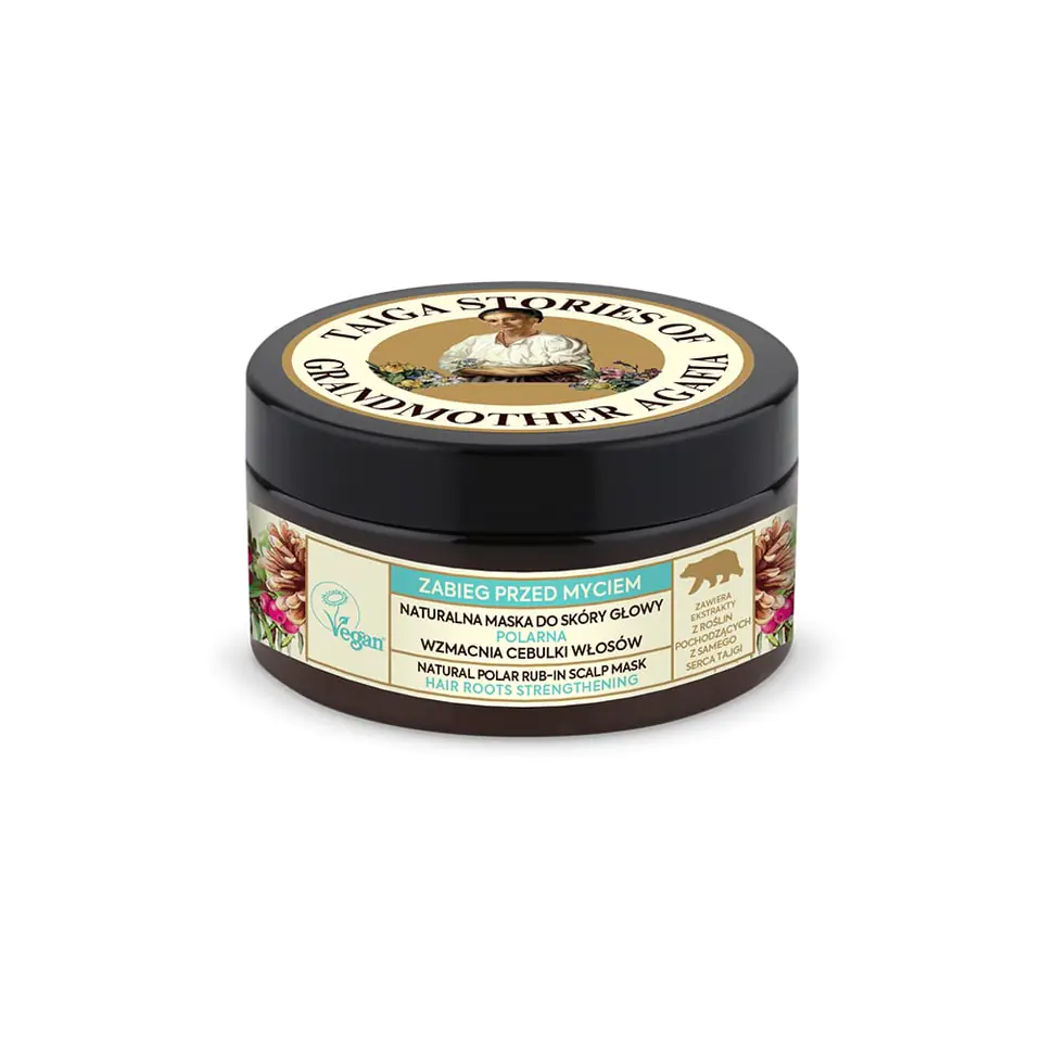 Maska polarna to zabieg do skóry głowy, który wykonuje się przed myciem włosów. Zawiera cenne substancje, które wzmacniają cebulki włosów i stymulują ich wzrost. Maska zapobiega wypadaniu włosów i wygładza ich strukturę. Zapobiega uszkodzeniom. Unosi włosy u nasady i dodaje im objętości. Nawilża skórę głowy i zapobiega powstawaniu podrażnień. Eurobio Lab to wschodnioeuropejski producent kosmetyków opartych na naturalnych i organicznych składnikach. Receptury Babuszki Agafii Taiga Stories to linia kosmetyków oparta na staranie wyselekcjonowanych ziołach pochodzących z Tajgi. Naturalna maska do skóry głowy wzmacniająca cebulki włosów z łopianem. Łopian, dzięki wysokiej zawartości witamin A, B, E, C oraz kwasów tłuszczowych intensywnie odbudowuje oraz odżywia włosy, sprawiając, że stają się mniej łamliwe. Bylica pospolita wspomaga stymulacje wzrostu włosów i wzmacnia ich cebulki. Dzięki zawartości witamin A oraz B6, dodaje włosom objętości. Świeże zioła z Tajgi zmiękczają i wygładzają włosy, ułatwiają rozczesywanie i wspomagają odbudowę włosów. Produkt posiada oznaczenie Vegan nadawane przez Towarzystwo Wegańskie. Oznacza to, że w produkcie nie ma składników pochodzenia zwierzęcego – nawet mleka lub miodu. Oprócz tego produkt ani jego składniki nie były testowane na zwierzętach.