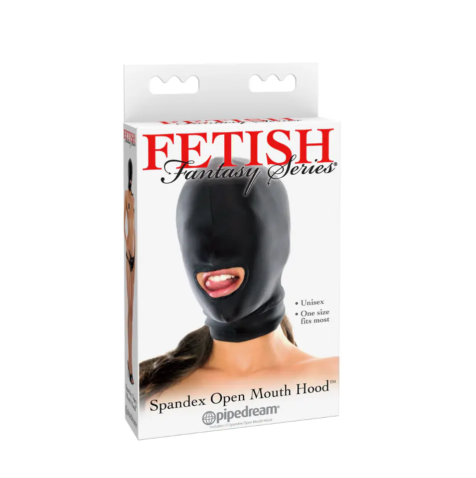 Pipedream Fetish Fantasy Series Spandex Open Mouth Hood Black to wykonana z elastycznego spandexu maska o otwartym ustniku bez wycięć na oczy. Ten design ułatwia odcięcie osoby uległej od zmysłu wzroku, co jednocześnie intensyfikuje doznania docierające do niej za pomocą innych zmysłów, jak i oddaje pełną władzę w ręce dominującego partnera.