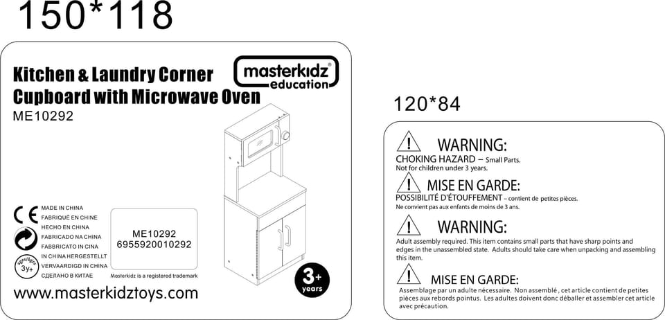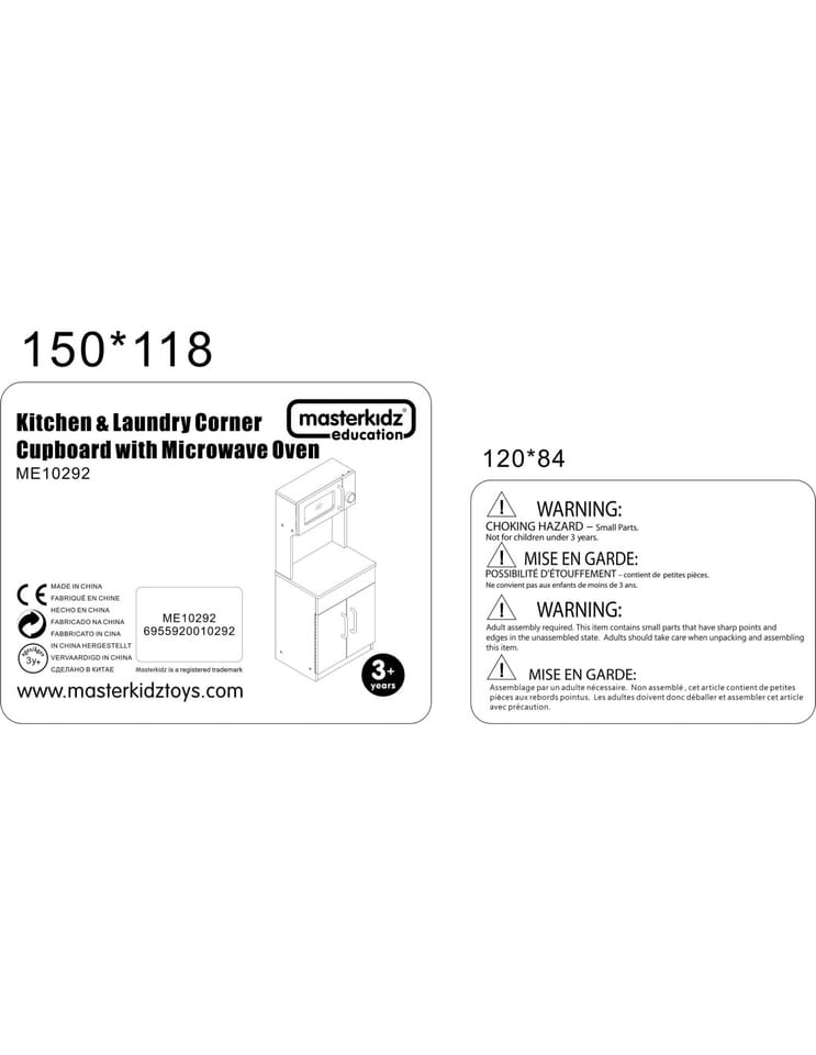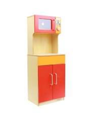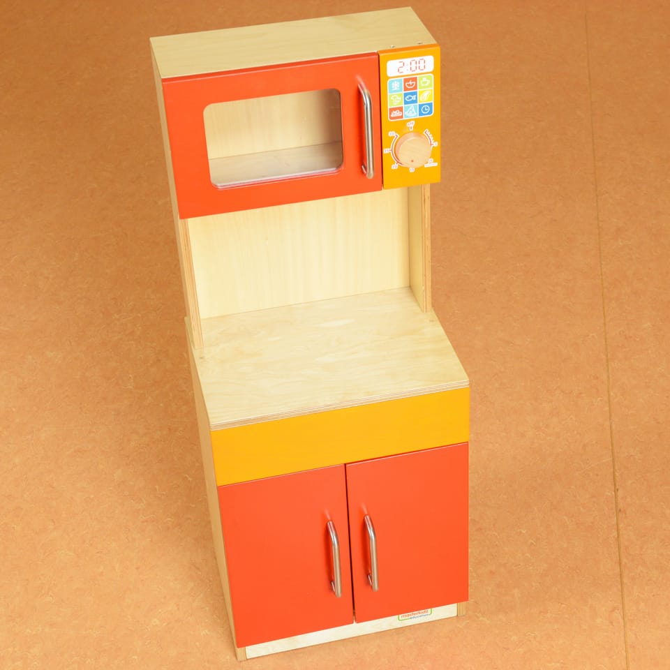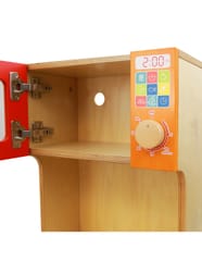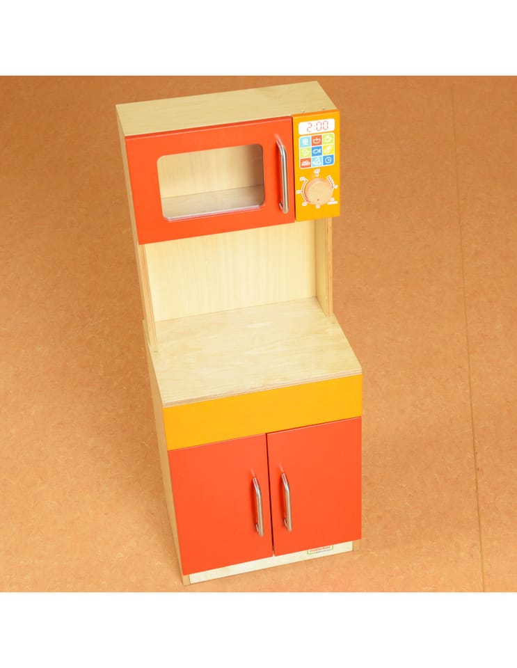 - ✔️ Wyposażony w otwieraną szafkę kuchenną oraz imitację mikrofalówki z realistycznym panelem sterowania i pokrętłem