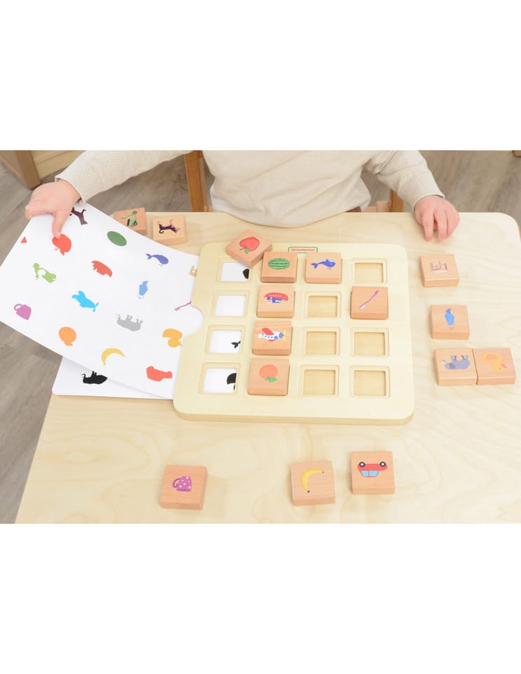 - - Trzy poziomy trudności dzięki wymiennym kartom: identyczne ilustracje, kolorowe sylwetki i czarne sylwetki.
